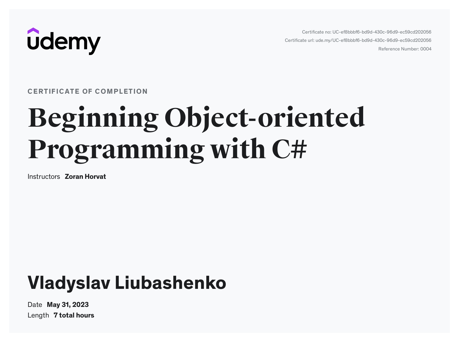 Learned OOP fundamentals applied to the C# programming language. Certicate URL.